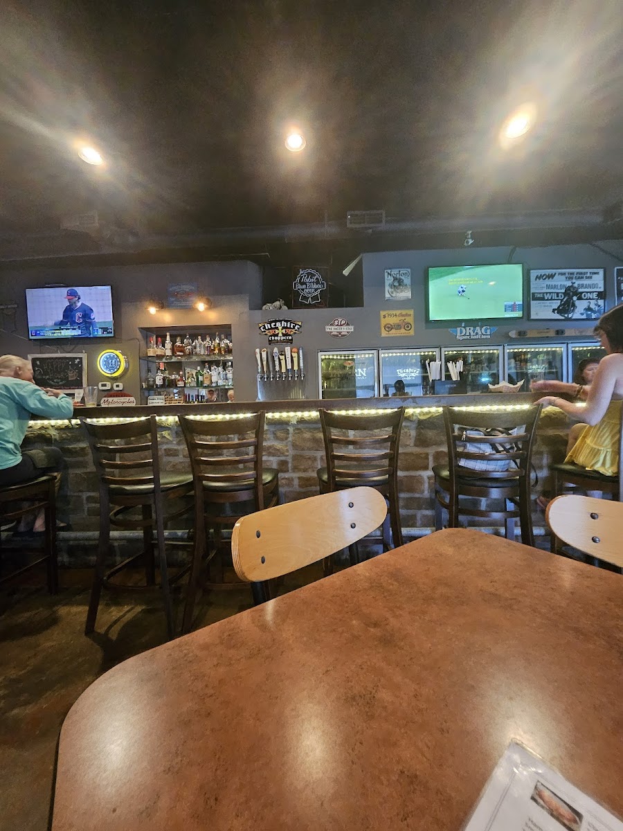 The pizza is thin and it is tasty. Wings are smoked and pretty good. They have 6 tapped beers and looked like a large selection of bottled. Also a basic selection of liquors. Atmosphere is rustic with motorcycle memorabilia.